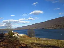 Raystown Lake is a reservoir in Huntingdon County, Pennsylvania. It is the largest lake that is entirely within Pennsylvania. The original lake was built by the Simpson family of Huntingdon as a hydroelectric project. The current 8,300-acre (34 km2) Raystown Lake was completed in 1973 by the Army Corps of Engineers. Raystown is around 200 feet (61 m) deep in the deepest area near the dam. The lake was created primarily to control floods, provide electricity, and support recreational activities. Allegheny Electric Cooperative operates the Raystown Hydroelectric Project and William F. Matson Generating Station at the Raystown Dam, a 21 MW, two-unit hydroelectric project.[2]