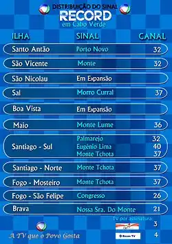 Record Cabo Verde is a channel of Record in Cape Verde.[1][2][3][4] It is the first Brazilian based channel to have its own version in Cape Verde. The network was launched on 31 March 2007.[5][6]
