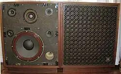 Some of these early 3-way models featured 10" and 12" woofers manufactured by Jensen ("Flex-Air") and CTS (Chicago Telephone Supply), 5" whizzer cone squawkers manufactured by Philips Electronics of the Netherlands, and 2" and 2.5" cone tweeters by Peerless of Denmark.[22] The Rectilinear speakers were typically, but not always, of ported design and finished in walnut with fabric or fretwork grilles. Many models featured one, or sometimes two, rear tone controls. The company offered some of their models as kits and "semi-kits".[23]