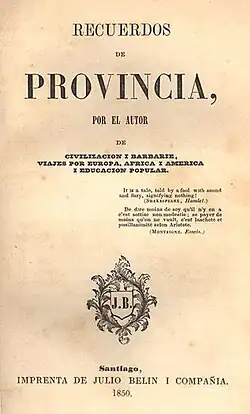 Recuerdos de Provincia (also known in English as: Recollections of a Provincial Past) is an autobiography written in 1850 by Domingo Faustino Sarmiento, a writer and journalist who became the seventh president of Argentina.