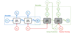 Encoder-decoder RNN without attention mechanism. Teacher forcing is shown in red.