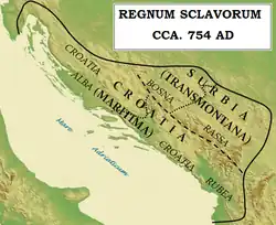 Svatopluk, King of Dalmatia... on Duvno field was crowned and his kingdom of Dalmatia is spread out into 4 regions: From the field called Duvno (Tomislavgrad), to Istria is called White Croatia... and from that field to Durrës is called Red Croatia; and the mountainous side from the river Drina to Macedonia is called Rascia, and to that river to here is called Bosnia. The whole sea coast is called Dalmatia and its mountains are Croatia...