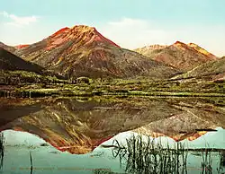 The Red Mountain Mining District lies from the divide northward to Ironton Park, halfway down towards Ouray. It was the site of a historic silver boom from 1882 until 1893, including the Yankee Girl and National Belle. Headframes of the old workings are still visible from the highway, as are the remains of the three largest communities: Red Mountain Town, Ironton, and Guston.[3][4] The sprawling Idarado Mine (Treasury Tunnel) continued digging until the 1970s, and reclamation of tailings is ongoing.