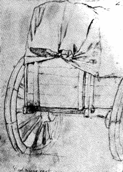 The cart, constructed of native materials, could easily be repaired. A supply of shaganappi and wood was carried as a cart could break a half-dozen axles in a one-way trip.[58] The axles were unlubricated, as grease would capture dust which would act as sandpaper and immobilize the cart.[58][60][61] The resultant squeal sounded like an untuned violin, giving it the sobriquet of "the North West fiddle". One visitor wrote that "a den of wild beasts cannot be compared with its hideousness".[62] The noise was audible for miles.[63] The carts were completely unsprung, and only their flexible construction cushioned the shocks transmitted from the humps and hollows of the trail.[64]