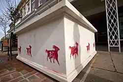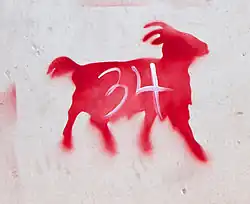 The red goats are stencils which were painted onto a number of white planters and other locations around Kingston's Stockade District from October 24–26, 2011. Varying reports claim that 32,[1] 33,[2] or 38[3] football-sized red goat stencils appeared throughout the uptown area.[4] The goats were placed on eleven planters which had been installed as part of a renovation project known as the Pike Plan, just prior to the project's dedication.[5] Numbers were painted over the goat stencilled designs the following night.[1][6]