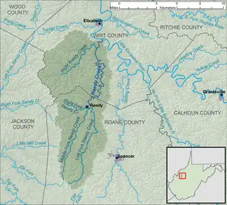 Reedy Creek is a tributary of the Little Kanawha River in western West Virginia in the United States. Via the Little Kanawha and Ohio rivers, it is part of the watershed of the Mississippi River, draining an area of 133 square miles (340 km2)[5] in a rural region on the unglaciated portion of the Allegheny Plateau. It is 22.6 miles (36.4 km) long, or 38.5 miles (62.0 km) long including its Left Fork.[6]