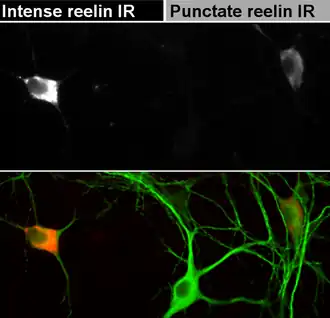 Having peaked just after the birth, the synthesis of reelin subsequently goes down sharply, becoming more diffuse compared with the distinctly laminar expression in the developing brain. In the adult brain, reelin is expressed by GABA-ergic interneurons of the cortex and glutamatergic cerebellar neurons,[33] the glutamatergic stellate cells and fan cells in the superficial entorhinal cortex that are supposed to carry a role in encoding new episodic memories,[34] and by the few extant Cajal-Retzius cells. Among GABAergic interneurons, reelin seems to be detected predominantly in those expressing calretinin and calbindin, like bitufted, horizontal, and Martinotti cells, but not parvalbumin-expressing cells, like chandelier or basket neurons.[35][36] In the white matter, a minute proportion of interstitial neurons has also been found to stain positive for reelin expression.[37]
