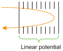 The electric potential in some other implementation of gridless reflectron (a so-called quadratic-field reflectron) is proportional to a square of a distance x to the mirror entrance: V(x)=kx2 thus exhibiting a case of one-dimensional harmonic field. If both the ion source and the detector are placed at the reflectron entrance and if the ions travel in a close proximity of the ion mirror axis, the flight times of ions in the quadratic-field reflectron are almost independent on ion kinetic energy.[14]