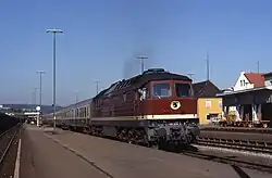 Passenger train hauled by a Class 132 diesel locomotive of Deutsche Reichsbahn in Schwandorf, 1991