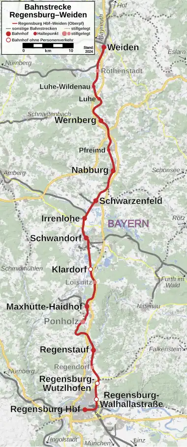 The Regensburg–Weiden railway is a two-track main line railway in Bavaria, Germany. It connects the Upper Palatinate district capital of Regensburg via Schwandorf with Weiden in der Oberpfalz.