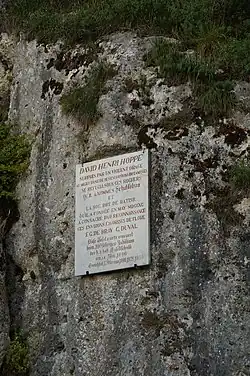 A commemorative plaque in French was installed in 1792[4] and has been restored, translated and extended in 1890 and 1975. It states:
