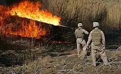 Flamethrowers can be used to clear brush, as demonstrated by United States Marine Corps personnel in Fallujah, Iraq in 2008. International agreements ban the United States from using flamethrowers in combat.