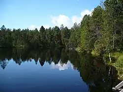 Rejvíz is also name of a national nature reserve, which was established in 1955 and covers 328.6 ha (812 acres).[2] It is composed of the largest peat bog in Moravia and Czech Silesia with small lakes of glacial origin. Recent studies have found the Rejvíz bog to be one of the best preserved woody raised bog complexes in Central Europe as core sampling reveals its organic deposit started to accumulate nine thousands years ago or even earlier.[3] An educational trail was opened in 1970 and leads from the Rejvíz Guesthouse to Velké mechové Lake in the western part of the nature reserve. It is 1.5 km long and there are six stops with information boards.