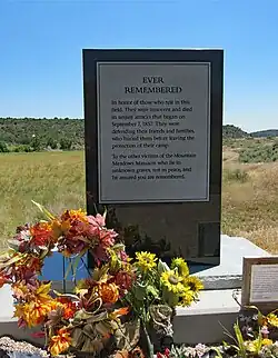During May 2009, in accordance to the wishes of some descendants, the LDS Church purchased 16 more acres of land in the Meadows.[35] This parcel of land is believed to be the location where the men and boys of the wagon train were killed and may contain the "upper gravesite."[35] On September 10, 2011, a new memorial site, built by the LDS Church in remembrance of the men and boys who were killed, was dedicated on this land. The memorial, located a mile northeast of the siege site and 1999 monument, includes a large polished stone monument and a rock embedded in the surrounding cement. Etched into the rock is a cross and it is believed the rock was once part of a cairn erected to cover the human remains found in the years following the massacre; two stone benches and an interpretive marker were also erected as part of the memorial.[36]