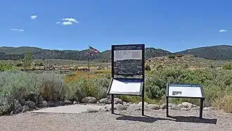 The replica was dedicated on September 25, 2005, with many descendants of the massacre victims and locals in the crowd.[55] During the dedication the stories of the surviving children were told while their descendants placed stones brought from southern Utah upon the cairn.[56] This replica is much smaller in terms of stones than the original, but it does include a large cross facing west, towards Utah, with the words "Vengeance is mine; I will repay, saith the Lord" carved into it. To the side of the replica cairn sits a large interpretative sign with the following inscription: