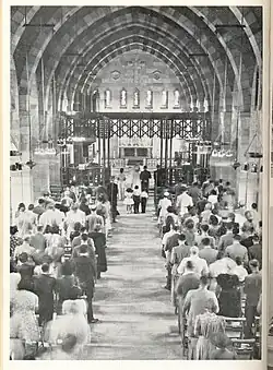 Mabel Esplin completed seven stained glass windows for the Cathedral.[7] In 1911, she was commissioned to design seven lancet windows and in 1912, lancet windows for the north wall of the north transept, which depicted St Alban, St Edmund, St Theodore and St Sebastian. She also completed in that year a three-light window for the Gordon Memorial Chapel with the theme "Hope, Faith and Charity". 1914 saw her complete a circular West window for the South Transept, a circular East window depicting "Death and Resurrection", and another three-light window in the Gordon Memorial Chapel with the theme "Fortitude, Justice and Wisdom". In one window and in an attempt to introduce local colour, the figure of Balthazar was portrayed in the costume of a Sudanese Sheikh.[8] Due to her ill health, Esplin was unable to complete the project and the illustration of the remaining windows was executed by Joan Fulleylove, who had earlier worked as Esplin's assistant,[nb 1] and who also designed a three-light window for St Mary's Church in Fulham.
