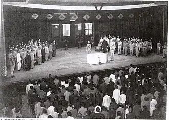 After the surrender ceremony, Chen Yi delivered a radio speech proclaiming that Taiwan and the Penghu Islands had rejoined China, marking Taiwan's retrocession.[2] George H. Kerr, who was invited to proofread the English translation of Chen Yi's Chinese speech, noted that it omitted any mention of the role played by the United States.[18] On the Taiwan Provincial Administrative Executive Office officially began operations, with its headquarters located at the former Taipei City Hall.[19]