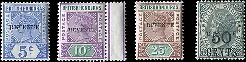 British Honduras (now known as Belize) issued revenue stamps in 1899. The only issue consisted of contemporary postage stamps overprinted "REVENUE". Four values exist - 5c, 10c, 25c and 50c on 1s, and there are two different sizes of the overprint - 11mm and 12mm long. Additionally there are a number of varieties in the overprint which are very collectible, such as "BEVENUE", "REVENU " and "REVE UE".[1] Despite being intended for fiscal use, they were also valid for postal use.