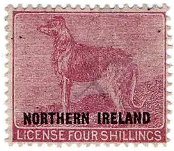 Apart from key types, Northern Ireland also issued overprints on a few British or Irish issues. In the 1920s, overprints were produced on British Excise stamps[2] and Foreign Bill key types, as well as on Irish Dog Licence stamps depicting the Irish wolfhound. In the 1960s and 1970s, many National Insurance stamps of Great Britain were also overprinted.[3]
