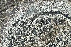 Rhizocarpon reductum is a widely distributed species of saxicolous (rock-dwelling), crustose lichen in the family Rhizocarpaceae.[2] This lichen forms thin, pale grey to brown crusts that crack into tiny angular plates, with scattered black disc-shaped fruiting bodies about 0.4–0.6 mm across. It has an extremely wide global distribution, being found on multiple continents including Europe, Asia, Africa, North and South America, Australia, New Zealand, and even Antarctica.