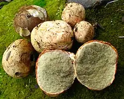 Rhizopogon evadens is a truffle-like fungus in the family Rhizopogonaceae. Found in North America, it was described as new to science by American mycologist Alexander H. Smith in 1966.[2] The fungus produces roundish to irregularly shaped fruitbodies measuring 2–5 cm (0.8–2.0 in) in diameter, with irregular lobes, wrinkles and depressions on the surface.[3] The peridium (outer tissue layer of the fruitbody) is whitish with light yellow to brown stains, and bruises red. The fungus has an unpleasant odor and a taste described as "metallic". Typical tree associates include pine, Douglas fir, and hemlock.[4] Initially white, the gleba (the interior contents) turn olive to olive-brown in maturity, with the contents developing a gelatinous consistency.[3] The smooth spores of R. evadens are narrowly ellipsoid in shape, and measure 6–8 by 2–2.3 μm.[4]