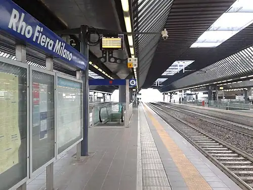 Rho Fiera railway station is a railway station in Italy. Located on the Turin–Milan railway, it serves the Fieramilano area in Rho. The station is located on Achille Grandi street. The train services are operated by Trenitalia and Trenord, and the station is one of the key nodes of the Milan suburban railway service.