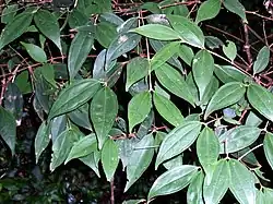 The opposite leaves are simple, not toothed, pointed, elliptical in shape, and around 5 to 10 centimetres (2.0 to 3.9 in) long. They are clearly triple-veined, with one central vein and two curved veins closely following the outline of the leaf. The net venation is visible on both sides. The leaves are downy underneath and have a greyish colour. The oil dots are transparent and visible with a hand lens. The tree's small branches are scaly with the same reddish bark as the trunk; the new shoots are covered in minute hairs.