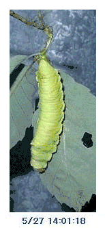 Larvae begin to enter the pupal stage around June and July.[6] The pupae are bright green to act as camouflage amongst the green foliage, the pupal case sports an open slit at the top to allow the adult moth to emerge.[4] They are hung using a silk thread on tree branches.[8] Empty cocoons can be spotted hung amongst defoliated tree branches during the winter months.[11][8]