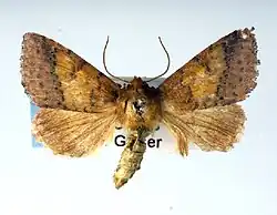 Rhodoecia aurantiago, the orange sallow moth or aureolaria seed borer, is a species of moth of the family Noctuidae. It has a scattered distribution from southern Maine and the hills around Boston, Massachusetts, west across southern Ontario to south-western Wisconsin and Missouri, south into Florida and Texas. It is listed as threatened in the US state of Connecticut.[1]