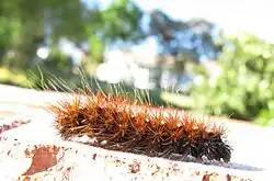 The larvae feed on Acacia, Calodendrum, Cassia, Cestrum, Clerodendrum, Cotyledon, Passiflora caerulea, Rhus, Senecio, and Tagetes species.[2] Though they are heavily armed with irritant urticating hairs they are readily eaten by fiscal flycatchers and Cape robin-chats that scrub off their hairs against the ground and swallow the larvae whole. Some cuckoos eat the larvae too.