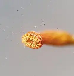 Rhynchostegium are autoicous.[3] Covered by a naked calyptra is a rostrate to long-rostrate operculum attached to a red-brown to brown, oblong-cylindric, weakly curved capsule, which is inclined or horizontal to a red-brown, smooth seta that has abruptly contracted perichaetial leaves at the base, with acumen straight to reflexed.[1][3] An annulus separates the operculum.[3] The peristome is xerochastic and perfect, which the red to orange-red exostomes have reduced trabeculae and cross-striolae at the base of the teeth; in rare cases the exostomes are narrow and yellow.[1][3] The broadly or narrowly perforated endostomes and developed to vestigial cilia are supported by a low or high basal membrane.[1] Spore diameters range between 9-16 μm.[3]