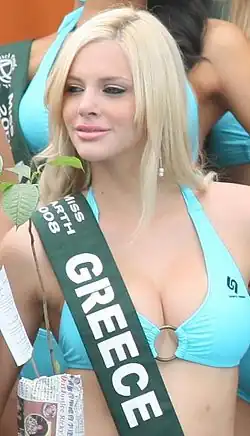 Ria Antoniou (Greek: Ρία Αντωνίου, [ˈria adoˈniu]; born 14 July 1988) is a Greek model and beauty pageant titleholder. In her career she became the winner of Miss Peloponnese 2007[1] and of Star Hellas – Miss Earth Greece 2008,[2] the runner-up in Sexiest Woman Alive 2008,[1] the 2nd runner-up in Miss Model of the World 2007.[1] She was also the "official Greek representative from Star Hellas"[3] in Miss Earth 2008.[3] She is also a singer, actress, television personality, internet celebrity and model. She has become a sex symbol of the 2000s and 2010s.