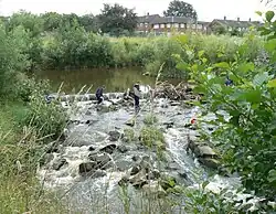 Prior to construction of the Ribble Link starting, British Waterways carried out an archeological evaluation to establish whether any important archeological sites would be disturbed by the new waterway. This identified Mill Field close to lock 8 as the probable location of a water mill, and found evidence of a ridge and furrow field system. Although the visible remains of this were unlikely to be disturbed by the construction work, parts of it continued below the surface where the channel would be excavated, and it was hoped that its boundary ditches might be located when the work took place.[10] The Environment Agency also carried out a fish survey, using electrofishing at eight sites along the brook, to ascertain the health of the brook as habitat for course fish. The fish were categorised as predator species, rheophilic species that prefer flowing water, and limnophilic species that prefer still water.[11] The survey recorded eleven species of fish, with rheophilic species prominent at most of the test sites, and limnophilic species much less so.[12] Flounder were also found in great numbers throughout the river, probably because the sand and silt on the bed of the river provide good habitat for spawning and for the survival of juvenile fish.[13] The report concluded that fish populations were surprisingly high for a river that drained an urban area, and that chub and flounder were doing particularly well.[14]