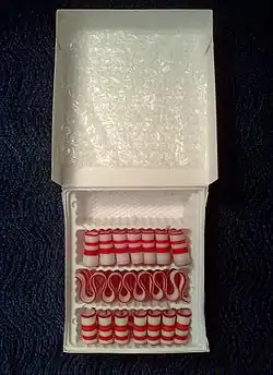 Ribbon candy is a type of hard candy which in North America most often appears for sale around the Christmas holiday season. It acquires its shape by first being fashioned as warm sugar into flat strips. A strip is then folded back and forth over itself to form a hardened ribboned stick. The sugar is often colored to appear festive, and the candy often has a glossy sheen. It is commonly made with extracts, often of different mint or citrus flavors. It is usually thin enough to melt quickly in the mouth, but because pieces of it are usually larger than bite size, biting into a stick of it causes shattering and shards. Many types of ribbon candies also tend to become sticky easily, usually either due to body warmth from being held, or simply from room temperature and humidity. It is often used like decor, put out on display in candy dishes, plates, or apothecary jars. When it is used in this way it tends to end up sticking together if it has been sitting out for an extended period of time.[1][2]
