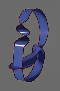 In the mathematical area of knot theory, a ribbon knot is a knot that bounds a self-intersecting disk with only ribbon singularities. Intuitively, this kind of singularity can be formed by cutting a slit in the disk and passing another part of the disk through the slit. More precisely, this type of singularity is a closed arc consisting of intersection points of the disk with itself, such that the preimage of this arc consists of two arcs in the disc, one completely in the interior of the disk and the other having its two endpoints on the disk boundary.