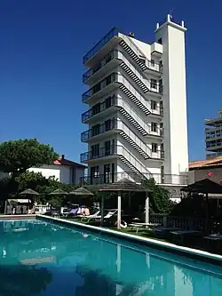 Many of Riccione's residential villas were developed in Liberty style, an Italian variant of Art Nouveau.[6][7] Particularly characteristic of these villas are their turrets, which offer a local panorama.[6] Riccione's urban landscape is heavily influenced Augusto Cicchetti, who designed much of Riccione's seafront and gardens.[14]