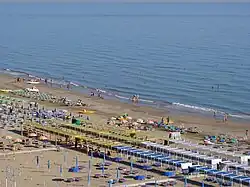 In November 1926, Riccione was officially designated as a tourist resort, with the power to run its own tourist agency.[97][98] Since then, the city has been one of the principal seaside resorts on the riviera romagnola, known for its wide, sandy beaches. Of its 6.3 kilometres (3+7⁄8 miles) of coastline, only 233 metres (255 yd) are prohibited for bathing by the mouths of the Torrente Marano and Rio Melo.[90] In 2020, Riccione numbered 432 hotels, residences, and other accommodation facilities, and 383 restaurants, bars, and chiringuitos, of which 109 are seasonal.[99]
