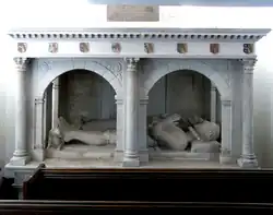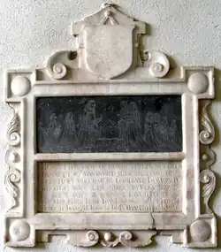 Richard Bampfield's monument, erected in 1604 by his son Amias Bampfield, survives in the south transept of Poltimore Church. It comprises two recumbent stone effigies, of Richard Bampfield and his wife, under a low canopy supported by arched openings and columns.[16] A view of the monument is obstructed by pews in front and by the balcony above forming the manorial pew of the Bampfield family. The 8 painted escutcheons on the cornice depict the arms of 5 of his 8 sons-in-law, each impaling Bampfield, and the 3 sons-in-law of his son and heir Sir Amias Bampfylde, each impaling Bampfield.
