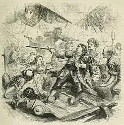 Carter took part in the Battle of Barfleur on 19 May. At the beginning of the action a light wind kept the Blue squadron some distance to leeward, and hopelessly out of the fight; but towards the afternoon a shift of wind permitted it to lay up to the enemy, and eventually to get to windward of them, thus placing them between two fires.[5] By about 6 p.m. Carter in the Duke and the rest of his ships were engaged with the enemy as the tide carried them among the French.[1] There was for a short time some sharp fighting,[5] in which Carter lost a leg.[1] He was struck by a splinter of one of his own yardarms, and fell dying on the deck. He would not be carried below. He would not let go his sword. "Fight the ship", were his last words: "fight the ship as long as she can swim".[8] He died of his wounds at 10 p.m.[1]