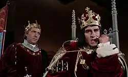 Richard III opened at the Leicester Square Theatre on 13 December 1955, with Queen Elizabeth II and Prince Philip attending the premiere.[18] Alexander Korda had sold the rights to the film to NBC in the US for $500,000 (about $4.44 million in today's dollars) and the film was shown on Sunday, 11 March 1956.[1][19] While many sources refer to the "simultaneous release" in the US of Richard III on television and at the cinema, it was in fact shown first on television.[20] It was not shown during prime time, but rather at 2:30 p.m. in the afternoon, so prime time ratings for that day were not affected by any pre-emptions for a special programme. It was the first 3-hour telecast of a film ever in the US and the first time that a film in the US had premiered on two media on the same day.[21] It had its US theatrical premiere at 8:30 p.m. at the Bijou Theatre in Manhattan.[22]