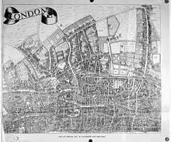Newcourt was a friend of Sir William Dugdale, and drew some views of religious houses, which were engraved for Dugdale's Monasticon Anglicanum. He later drew a map of London which was to become the most important one of the city executed before the Great Fire. It was engraved by William Faithorne the Elder and published in 1658 as An Exact Delineation of the Cities of London and Westminster and the Suburbs thereof, Together with ye Burrough of Southwark And all ye Thorough-fares Highwaies Streetes Lanes and Common Allies wthin ye same Composed by a Scale, and Ichnographically described by Richard Newcourt of Somerton in the Countie of Somersett Gentleman.[1] The map was a large one, printed on four sheets and measuring more than five feet across. Although drawn as a "view map," it offers little information about individual buildings, the representations being largely conventional.[3] It became extremely rare; for much of the 19th century only one copy was known, in the Bibliothèque Nationale in Paris, but during the 1850s a second copy was discovered, and a facsimile published.[3]