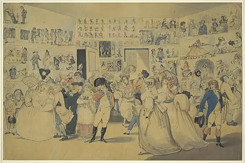 Born in London, Newton published his first caricature at thirteen. His work included caricatures expressing the English prejudice of the Scots as lean and hungry opportunists. He worked for radical publisher William Holland, producing anti-slavery works among his output, as well as "rude assaults" against Napoleon and the royal family.[1] Newton minded Holland's shop when Holland was imprisoned for sedition during 1793โ€“94. His watercolour (now in the British Museum) of fashionably dressed Londoners looking at prints in Holland's shop in Oxford Street, London, gives a depiction of an 18th-century print shop, and images of many of Holland's actual prints can be recognized on the walls.[2] In 1794, Holland published an edition of Laurence Sterne's A Sentimental Journey Through France and Italy with twelve plates by Newton.[3]