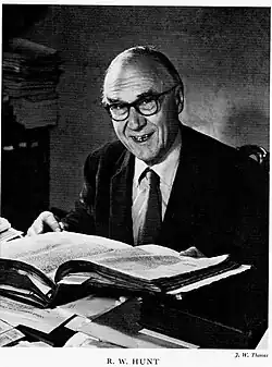 Richard William Hunt (11 April 1908 – 13 November 1979)[1] was a scholar, grammarian, palaeographer, editor, and author of a number of books about medieval history. He began his career as a lecturer in palaeography at Liverpool University, and worked at Bush House during World War II. In 1945 he obtained the position of Keeper of the Western Manuscripts at the Bodleian Library, and he relocated to Oxford, remaining in the position until 1975.[2] During his tenure as keeper he held a fellowship at his alma mater, Balliol College, Oxford.[3]