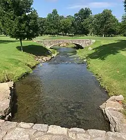 Richland Creek has an approximate elevation of 390 feet (120 m).[5] Its mouth is a south branch of the Cumberland River shown at these coordinates:[a] 36°09′51″N 86°53′18″W / 36.1642237°N 86.8883339°W. Its source is in west Nashville and consists of the confluence of at least eight streams. One is near Tyne Boulevard at Fredericksburg Drive and mostly follows Tyne northwest toward Belle Meade Boulevard. There it is joined by a Chickering Branch arising near Chickering Lane and flowing along the east side of Chickering Road.[6] After crossing under Belle Meade Boulevard, Richland Creek is joined by its Belle Meade Branch (which flows roughly parallel to Harding Place west of Hillsboro Road) then winds through the golf course of Belle Meade Country Club.