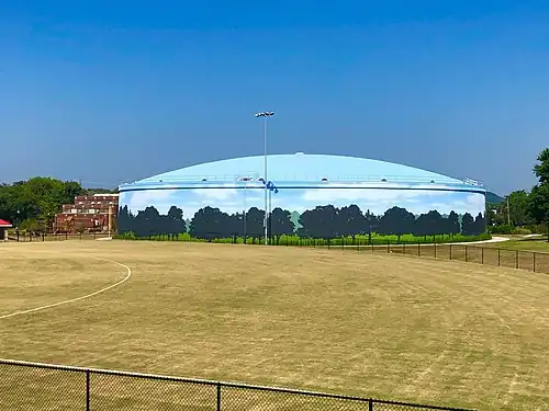 Construction began in 2009 on the West Park Equalization Basin and Wet Weather pump station.[13] This includes two above-ground tanks large enough to temporarily hold 31 million gallons of liquid when sewer flow exceeds the capacity of the treatment plant. The tanks, called "equalization facilities", hold the sewage until the stormwater recedes, then send the sewage to the treatment plant at an optimal processing rate. The project is aided by a wet-weather pump that can handle 45 million gallons per day.[13] The West Park Project was dedicated by Mayor David Briley on August 18, 2018,[14] and its site includes recreational facilities including a lighted softball field, basketball court, picnic area, a pavilion with public rest rooms and other amenities.[13] Artist Eric Henn created a mural on the tank to add public art to the neighborhood.[14]