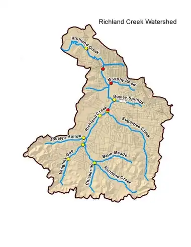 The Richland Creek Watershed consists of 17,712 acres (27.675 sq mi) within the city of Nashville, approximately 4 miles west of downtown. The Richland Creek watershed includes at least eight tributaries, not all of which are named:[4]