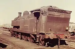 With the Richmond Vale Railway nearing completion there was a need for larger locomotives to haul the trains over the line, John Brown purchased four large 0-6-4T side-tanks locomotives from England. These had been built by Beyer, Peacock & Company in 1885–86 for the Mersey Railway in Liverpool.[28] The first three were purchased in 1905, with the fourth loco purchased in 1908. Before these were shipped to Australia they had their vacuum operated brakes and condensing apparatus removed, they then had enclosed cabs and steam brakes fitted. Upon arrival in Australia they were given J & A Brown Nos. 5–8 and were known as the 5 class. No. 5 was originally Mersey Railway No. 1 and was built in 1885 (builder's No. 2601) and was named The Major, No. 6 was Mersey Railway No. 7 and was built in 1886 (builder's No. 2607) and was named Liverpool, No. 7 was Mersey Railway No. 9 and was built in 1886 (builder's No.2782) and was named Connaught, No. 8 was Mersey Railway No. 4 and was built in 1885 (builder's No. 2604) and was named Gladstone. Initially Nos. 5–7 still carried their Mersey Railway nameplates whilst in J & A Brown ownership, no photographic evidence has been found of No. 8 with its nameplates intact whilst in J & A Brown service. After the introduction of the ROD locomotives the 5 class were set aside when major repairs were required. Nos. 7 and 8 had been withdrawn by 1934 and No. 6 was sold to Cessnock Collieries in 1934 for use at Kalingo Colliery. In 1936 after a period of storage No. 5 was transferred to the JABAS Abermain Colliery railway system where it remained until 1939 it was then placed in storage. In 1941 after being overhauled it was used on the Hexham to Stockrington trains until suffering boiler defects in July 1942 when it was withdrawn.[29] No. 5 is now preserved at the NSW Rail Museum, Thirlmere.[30] The Driving wheelset from No.8 also survives at Richmond Main.
