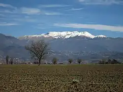 The Rieti Plain has a semi-circular shape and covers around 90 km2 (35 sq mi),[1] ranging from 370 to 380 metres above sea level; it is 14 km long and averages 7 km in width.[2] It is bordered all round by mountains: Monti Sabini to the west and south and Monti Reatini to the east (the highest peak being Monte Terminillo, a popular skiing resort, 2,217 metres (7,274 ft) high).