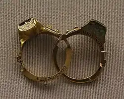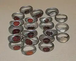 Rings have been found in tombs in Ur dating back to circa 2500 BC.[3] The Hittite civilization produced rings, including signet rings, only a few of which have been discovered.[4] People in Old Kingdom Egypt wore a variety of rings, of which a few examples have been found, including the famous scarab design.[4] Rings became more common during the Egyptian Middle Kingdom, containing increasingly complex designs.[4] Egyptians made not only metal rings but rings from faience, some of which were used as new year gifts.[5] Native styles were superseded by Greek and Roman fashions during the Ptolemaic dynasty.[4]