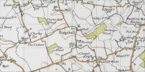 Ringshall is a village and civil parish in the Mid Suffolk district of Suffolk in eastern England. Located around four miles south of Stowmarket, and 13 miles north west of Ipswich.[3]